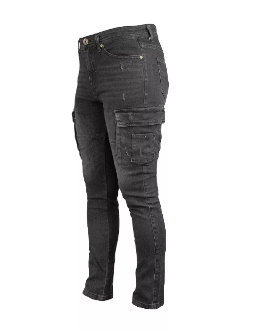 Cargo nadrág, karcsúsított szabás, rugalmas farmer anyag koptatásokkal