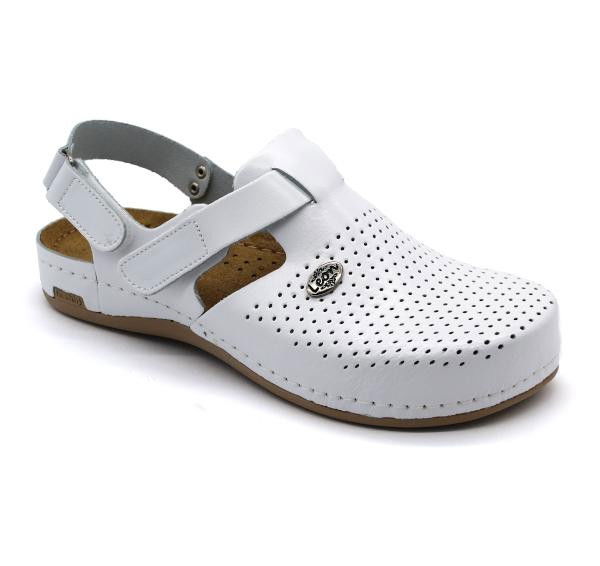 Női bőr klumpa/szandál, műanyag csúszásgátlós talppal. Oldalt és hátul tépőzárral szabályozható. A talpbetét puha zselés, bőr. A természetes anyagnak és a felsőrész lyukacsosságának köszönhetően , jól szellőzik. Ajánlott mindennapos használatra: utcára vagy munkahelyre ( több órás, szaladgálós munka alatt sem fárad el a láb ). Ez a termékünk rendelkezik minőségi, munkavédelmi bevizsgálással.