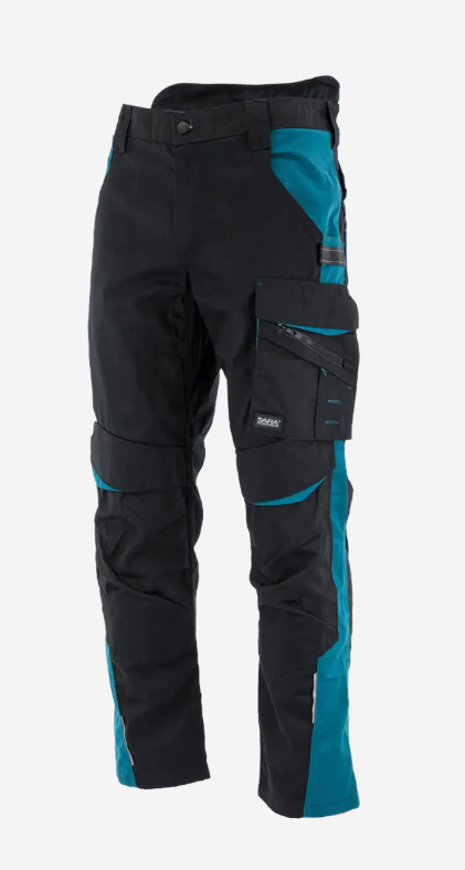 Anyaga: 65% poliészter, 35% pamut. Anyagvastagság: 245g/m2. Univerzális munka és hobbi célra alkalmas modern viselet petrol kék betétekkel. Nagyon tartós anyag, elasztikus betétekkel a nagyobb kényelemért, több funkcionális zsebbel és fényvisszaverő elemekkel.
