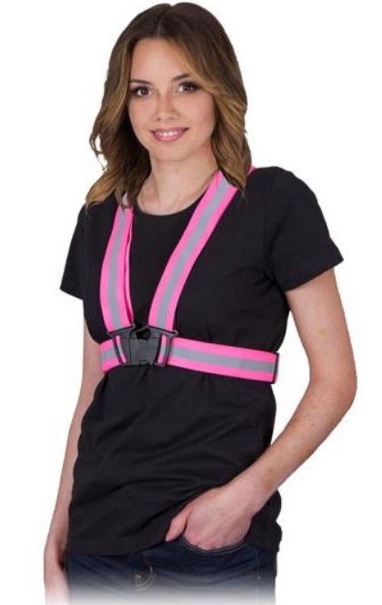 Anyaga: 100% poliészter, heveder szélesség: 3,7 cm. Műanyag csattal rögzíthető, fényvisszaverő csíkokkal ellátott. Állítható hossz (70-106 cm) és körméret (71,5-105,5 cm). Egyesével csomagolva.