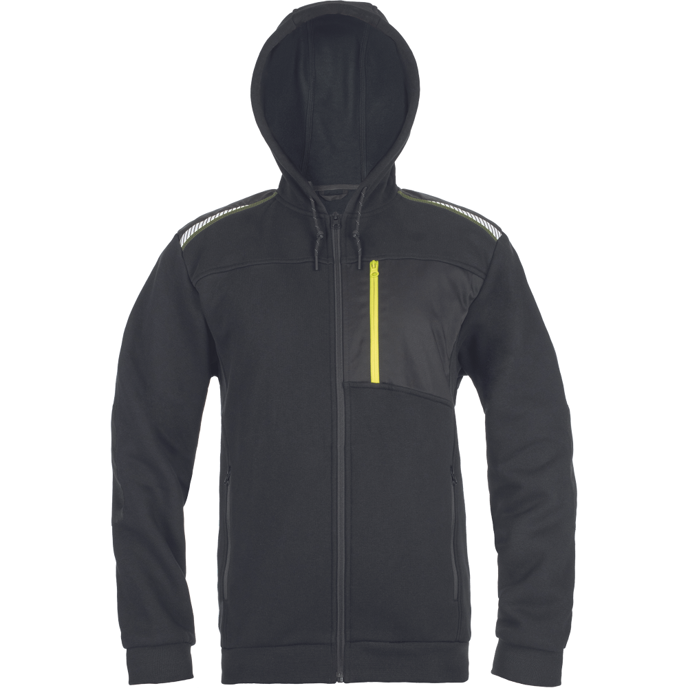 • férfi cipzáras kapucnis kardigán • 2 oldalzseb • 1 mellzseb cipzárral • megerősített vállrészek fényvisszavető csíkokkal • rugalmas derékpánt és mandzsetta