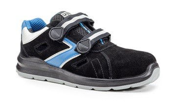 - biztonsági védőszandál puha, szellőző velúrbőr felsőrésszel és hálós betétekkel fekete és kék/fehér színben