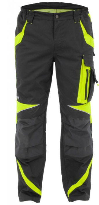 Gombbal rögzített nadrág, a derékrész oldalán elasztikus pántokkal, öv számára kialakított bujtatókkal, több különböző funkciójú zsebbel, térdpárna behelyezésére szolgáló tépőzáras zsebbel, térd résznél fényvisszaverő csíkokkal. Anyaga: Canvas Active - 58% pamut/40% poliészter/2% spandex - speciális szövésű anyag, melyben a spandex két irányban ad rugalmassági lehetőséget a szövetnek. Anyagvastagság: 260g/m2
