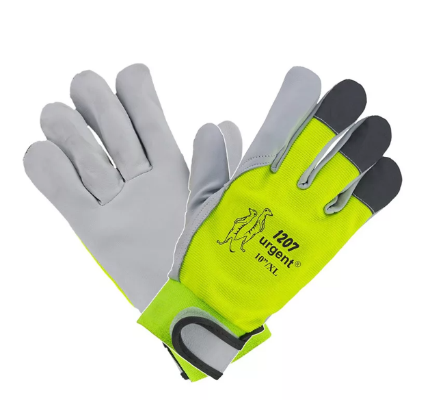 Kecskebőr védőkesztyű láthatósági poliészter kézfejjel, tépőzáras mandzsettával, három ujjhegyen fényvisszaverővel ellátva.