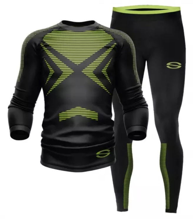 Varrat nélküli, kontrasztos betétekkel ellátott hosszű ujjú felsőrészből és alsonadrágból álló aláöltözet. Könnyű mozgást és kiemelkedő kényelmet biztosít. A szövetben található nylon anyag segíti fenntartani a testhőmérsékletet.