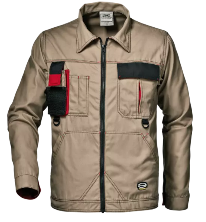 Minőségi olasz munkaruha. Extra könnyű és rugalmas. Megerősített dupla varrásokkal. Cipzáras záródással, két első zsebbel, mellzsebbel mely telefontartó és tolltartó zsebeket is tartalmaz. Szerszámtartó gyűrűvel. Csuklója gombos záródású. Fekete Cordura betétekkel és piros zsebhasítékokkal.