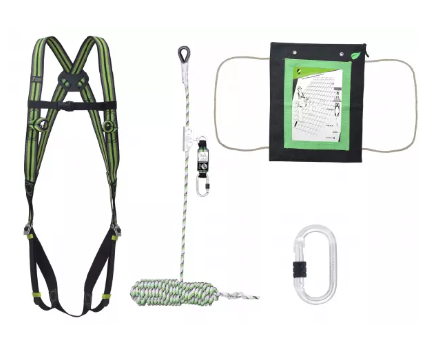 A készlet 2rögzítési pontú testhevederből, 10 m hosszú kernmantle kötélrögzítő vezetékes energiaelnyelő zuhanásgátlóból, egy 18mm kapunyitós acél csavaros karabinerből és egy jutazsákból áll.