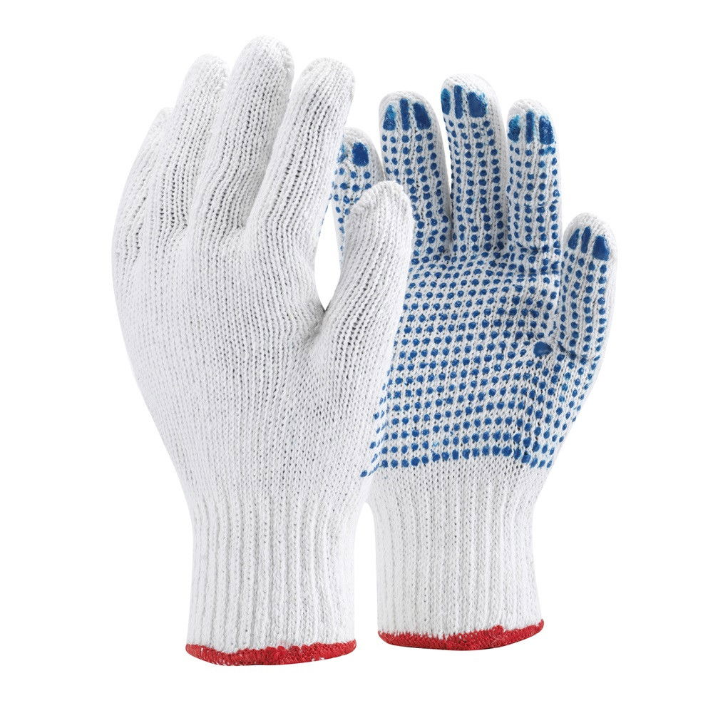 Pamut/poliészter anyagú cérnakesztyű, tenyerén PVC pöttyözéssel, mely csúszásbiztos fogást biztosít.