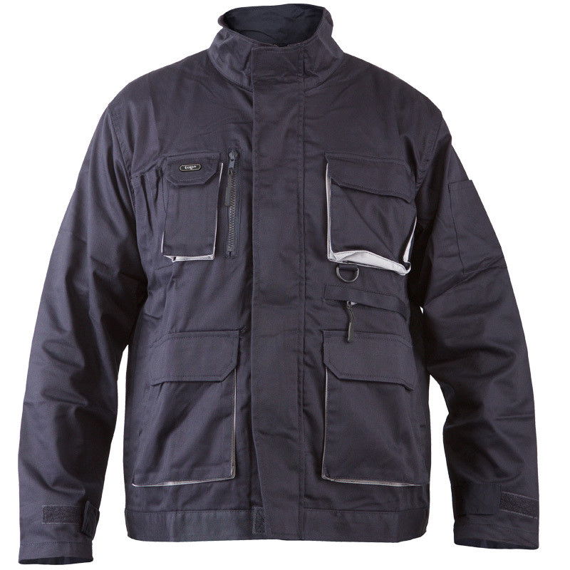 Munkakabát dzsekifazonú, rejtett húzózáras, nyolc zseb, plusz derékon hátsó nagy rekesz, kevertszálas alapanyag