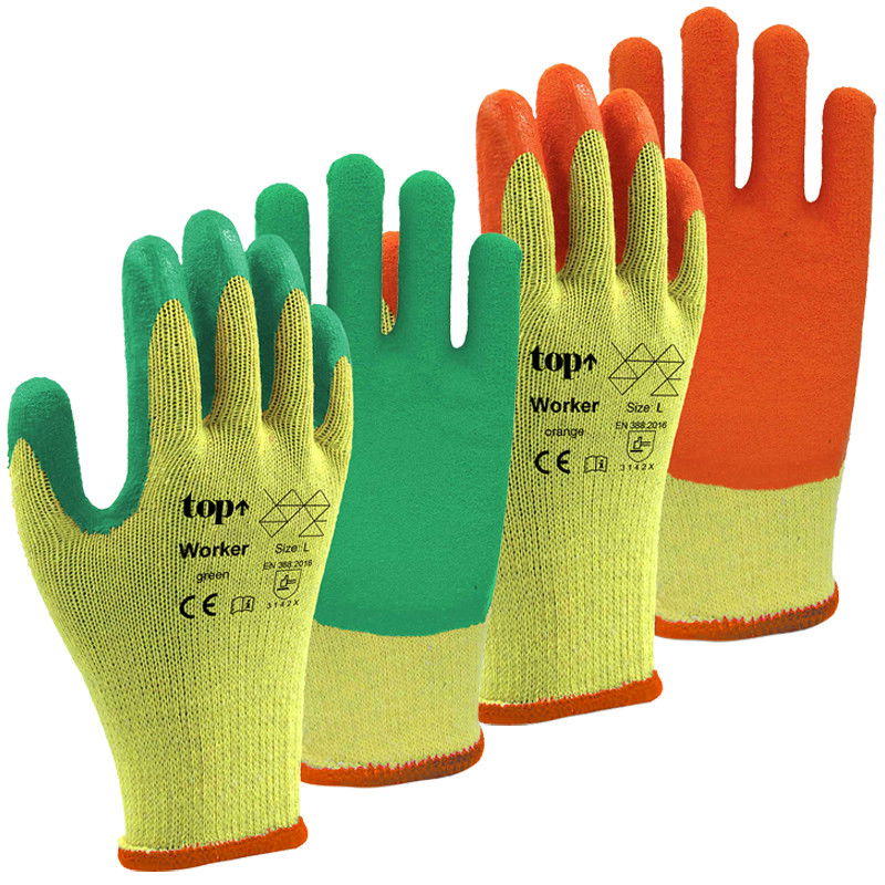 TOP Worker green (LX600) védőkesztyű, poliészter kesztyű latex mártással, zöld vagy narancssárga tenyérrel.