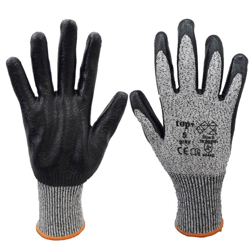 TOP 5-7 TOP 5 nitril mártott kevertszálas vágásbiztos védőkesztyű, gumírozott mandzsetta, szürke/fekete,