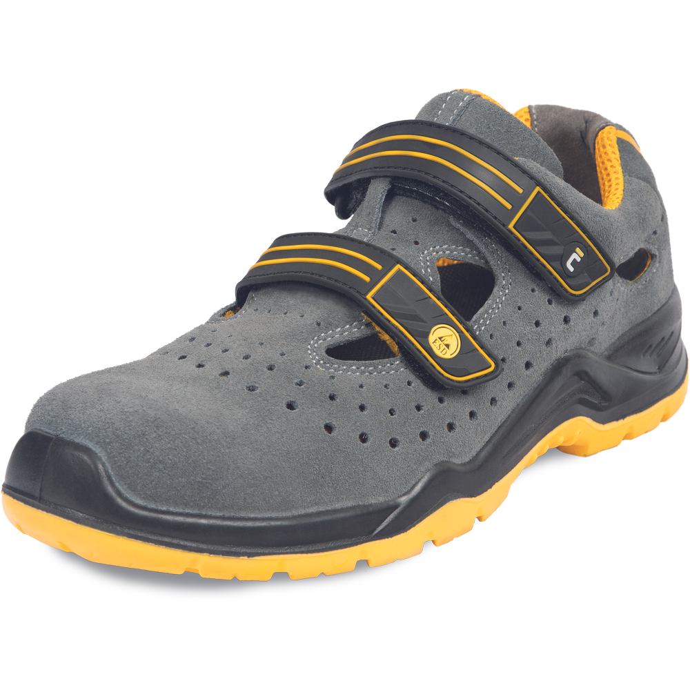 » biztonsági szandál szürke-sárga színkombinációban » teljes hosszában perforált nubuk bőr felsőrész » olajálló, csúszásgátló talp kettős sűrűségű poliuretánból » kényelmes, perforált belső talpbetéttel, energiaelnyelő sarokkal, kompozit lábujjvédővel, és kompozit köztappal » ESD védelem » nem tartalmaz fém alkatrészeket